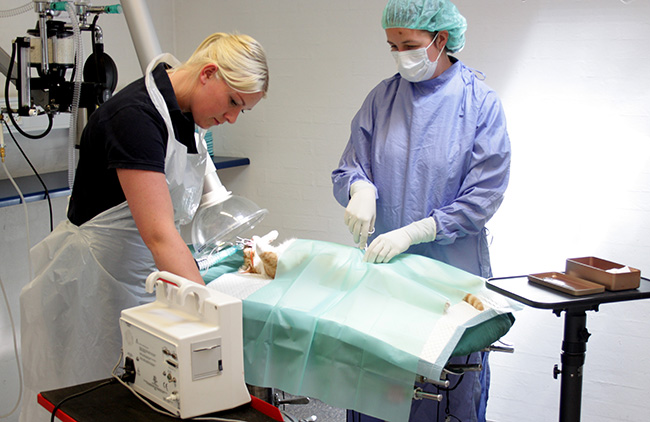 | På Dyrenes Klinik foretager vi de fleste almindelige kirurgiske indgreb. Alle kirurgiske indgreb sker under narkose med gode og sikre narkosemidler. Vi lægger vægt på, at bedøvelsen af dit kæledyr foregår under så rolige omstændigheder som muligt. Vi er altid mindst en dyrlæge og en veterinærsygeplejerske ved operationerne. Under narkosen er dit dyr konstant overvåget - fra det sover til det vågner. Vores erfarne personale kontrollerer at vejrtrækning og kredsløb fungerer perfekt og træder til øjeblikkeligt hvis der er afvigelser fra det normale. Vi benytter bl.a. det nyeste overvågningsudstyr, som måler puls, vejrtrækning, blodtryk, iltmætning og temperatur under narkosen.